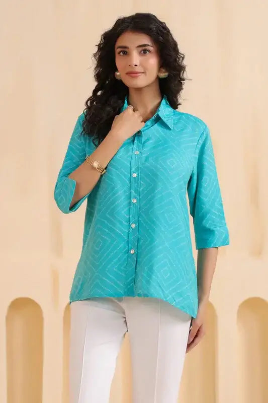 Aqua Geometry Classic Button-Down Muslin Silk Shirt