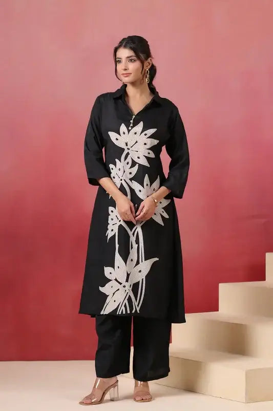 Step into elegance with the Midnight Black Leaf Embroidered Russian Silk Co-ord Set. Luxuriously smooth Russian silk combined with delicate leaf embroidery creates a striking look that’s both chic and playful. Perfect for turning heads at any event, this co-ord set offers effortless style paired with unmatched comfort. Let your outfit do the talking while you enjoy the silky-soft feel all day long.